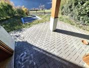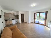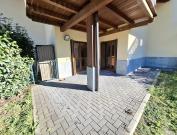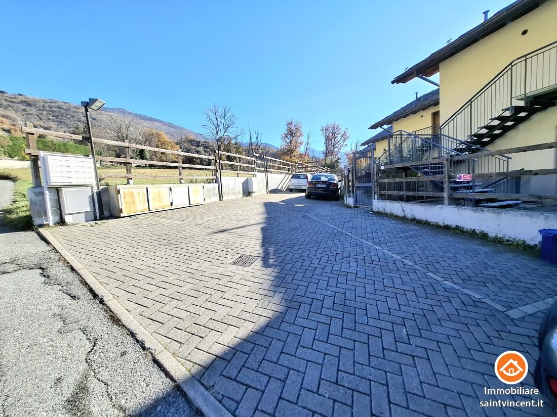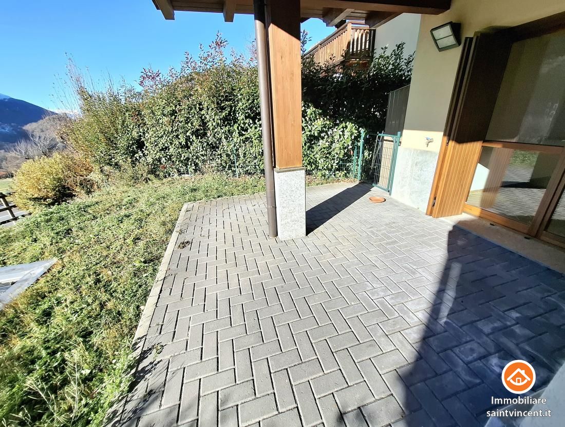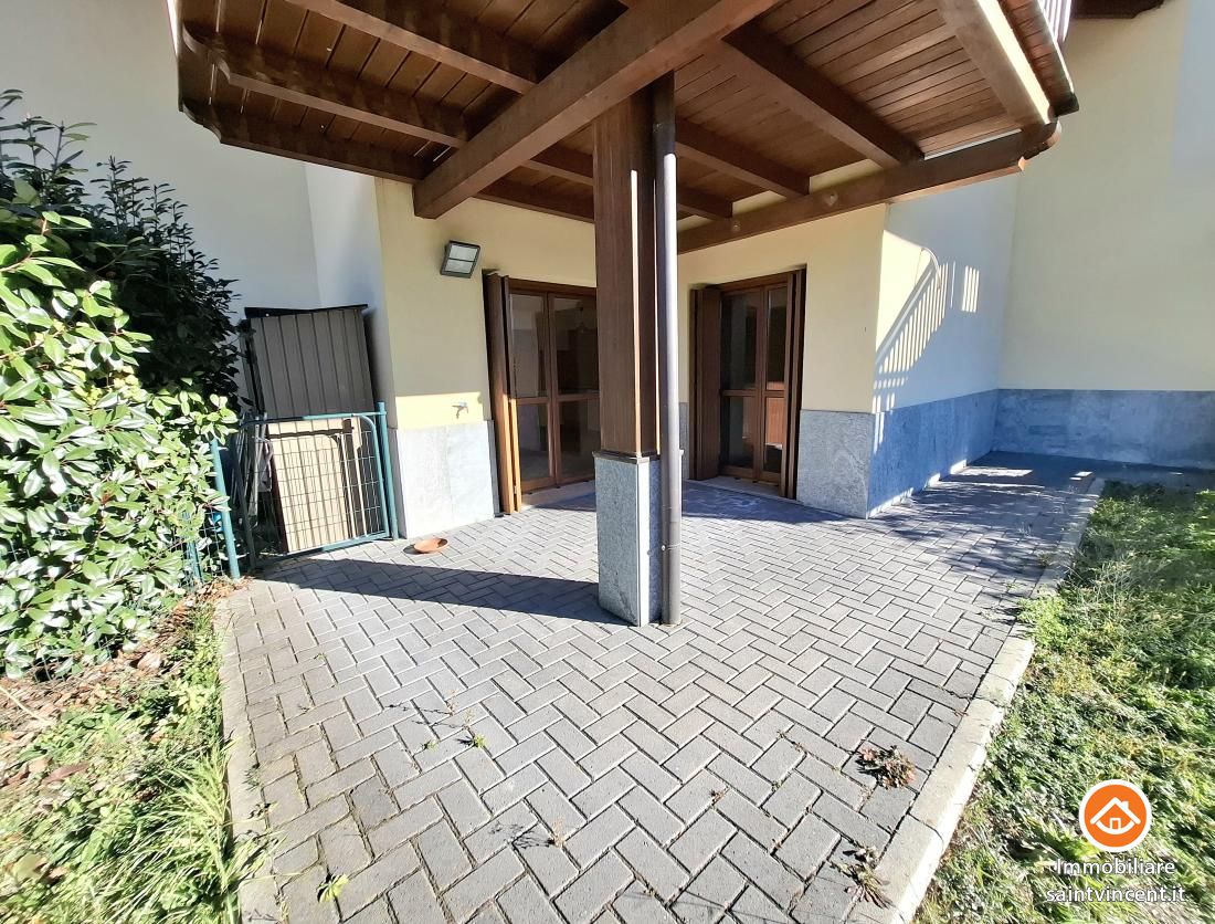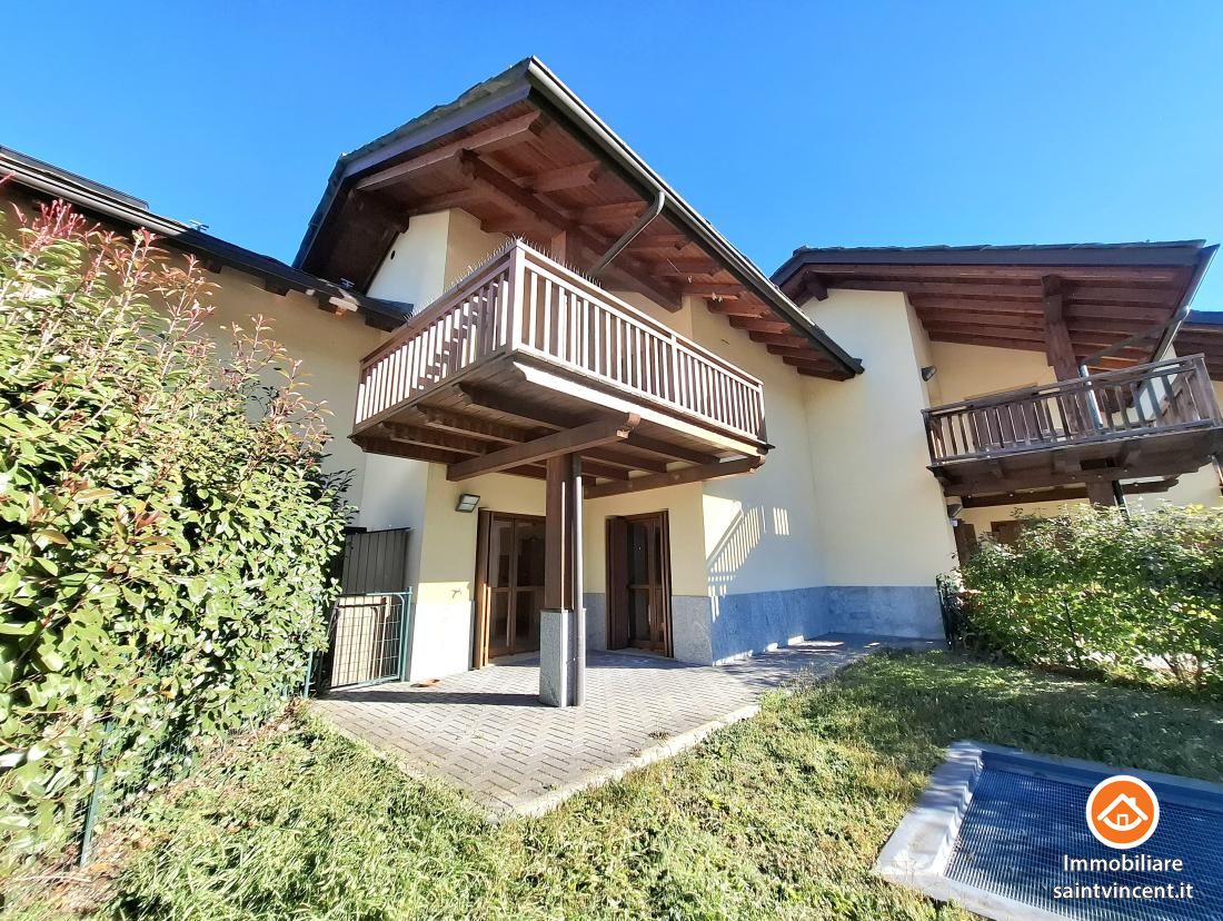 Saint-Vincent: in complesso di recente costruzione, appartamento al piano terra in contesto signorile di villette a schiera composto da angolo cottura con soggiorno con sfogo sulla terrazza ed il giardino privato, camera matrimoniale anch'essa collegata alla zona esterna e servizio finestrato con doccia. Completano la proprietà la cantina, l'ampio garage di circa 30 mq e il posto auto condominiale. Termo semi autonomo a metano. Classe energetica C.