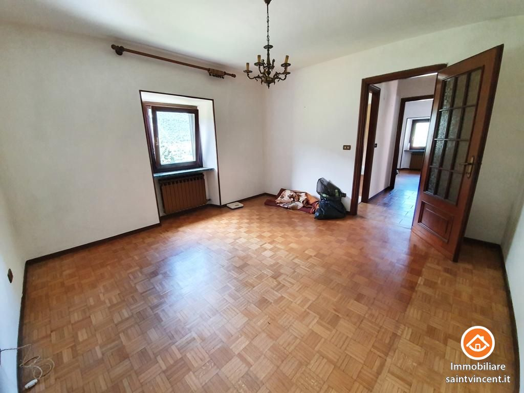 Pontey: appartamento al primo piano composto da ingresso su soggiorno con camino in pietra, cucina abitabile, 2 camere, disimpegno e servizio finestrato. Completo di balconata d'ingresso e cantina al piano interrato. Termo autonomo a metano.