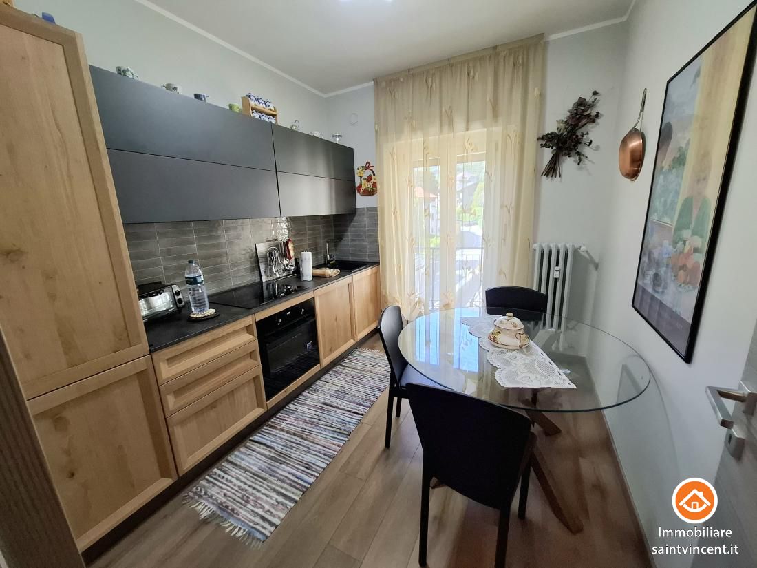 Saint-Vincent: adiacente al centro, all'inizio di Viale IV Novembre, proponiamo in vendita ampio trilocale al terzo piano servito da ascensore. L'appartamento è stato oggetto di alcuni lavori di ristrutturazione tra i quali la sostituzione degli infissi interni ed esterni, il rifacimento dell'impianto elettrico e la ristrutturazione completa della cucina. L'unità immobiliare apre sull'ingresso, che divide gli ambienti in maniera funzionale, la cucina è abitabile e corredata di un balconcino ad ovest, il soggiorno è ottimamente esposto al sole e dotato di un balcone a sud, le camera sono entrambe matrimoniali con pavimenti in parquet ed il servizio finestrato è attrezzato di box doccia. Completo di cantina al piano interrato. Riscladamento centralizzato con ripartitori di consumo.